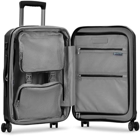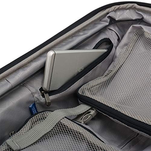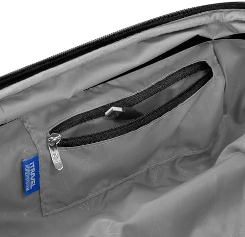 22” carry-on spinner features a built-in USB port, type C port, and an interior power bank compartment that provide quick connection to your portable electronic device for a quick charge. (power bank not included. )
