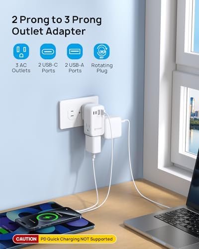 【7 in 1 Travel Adapter】The 2 prong to 3 prong outlet adapter equipped with 3 outlets and 4 USB ports(2 USB C), converts a polarized 2 prong outlet to 3 prong grounding outlet or USB port, allowing you to power 7 devices simultaneously to save more time. Ideal for the non-grounded outlets in older house.