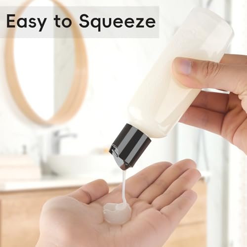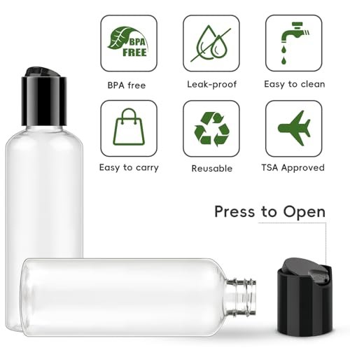 Secure Lid: Each travel size empty bottle comes with a black disc top cap that requires pressing to open and close, preventing leakage and spillage