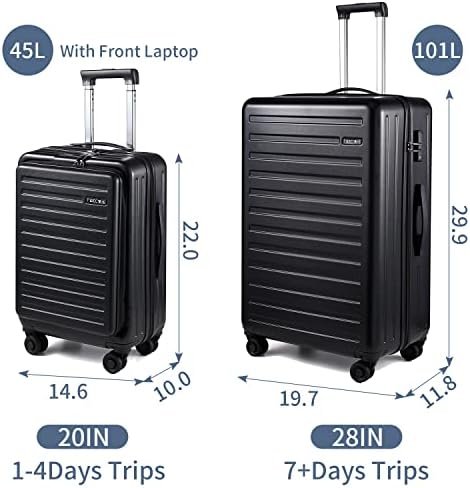 2 Pieces Luggage Set Includes: 20″ carry on luggage with front laptop pocket & 28″ checked luggage, can be stored one into another. 20″=14.57*10.03*22.04in=7.93Ibs= 45L, Suggested laptop 15.6 inch or Ipad, etc for front laptop pocket. Different airlines have different baggage allowances, please refer to the requirements of each airline for details; 28″ =19.68*11.81*29.92in=9.81Ibs= 101L capacity maximize your packing power and the ideal checked suitcase for longer trips.