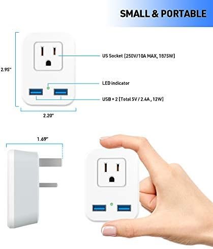【US outlet and Dual USB charging ports】UK travel adapter allows users to charge three devices or electronics simultaneously, and it is perfect gift for family and friend; no need to fight for wall outlets while in a hotel or motel. Input voltage: 100-240V, (50/60Hz), USB output: 5V/2.4A (Max) for iPhone, iPad and tablets. Total wattage: 1875W (250V, 10A)