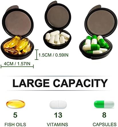 SMALL AND LIGHT: The diameter of each pill organizer is 1.57 inches/4 cm and the height is 0.59 inches/1.5 cm; The medicine box is very light and compact, which is convenient for you to carry around and meet your needs anytime and anywhere.
