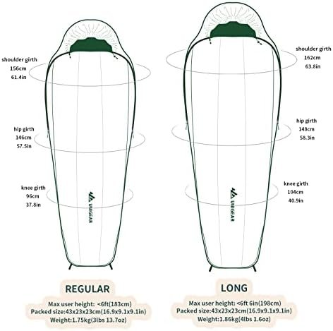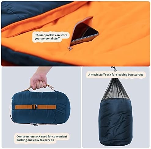 LIGHTWEIGHT & COMPACT: Complete with a compressible storage bag, these lightweight sleeping bags are extremely easy to carry on the go. They also come with a mesh stuff sack that significantly helps the storage when not in use. These sleeping bags for adults and teens come in two sizes – Regular: 183cm max. height(weight 1.75kg,Packed dimension:43*23*23cm ) and Long: 198cm max. height( weight 1.86kg,Packed dimension:43*23*23cm)