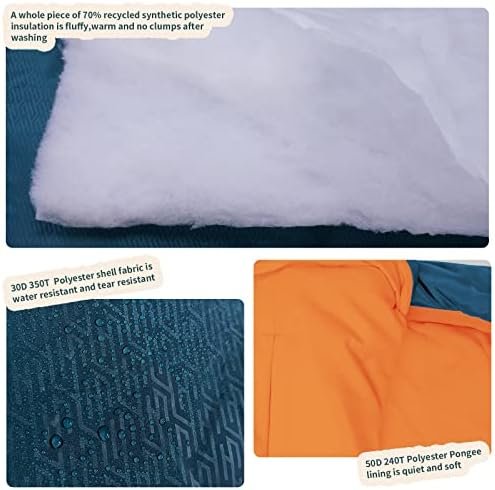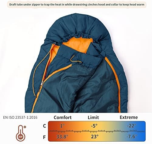 KEEP WARM & COZY: Our mummy-shaped sleeping bag has been expertly designed to keep you warm, even passing the EN ISO 23537-1:2016 temperature test with the ratings Comfort: 1℃(33.8℉), Limit: -5℃(23℉), Extreme: -22℃(-7.6℉).The products are insulated with 2 layers of 70% recycled down-like synthetic polyester to ensure that you have enough warmth to provide a restful night. You can even transform them into a double sleeping bag by simply zipping them both together for optimum heat