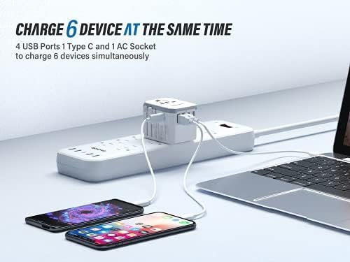6 IN 1 TRAVEL ADAPTER – Charge up to 6 devices simultaneously at high speed with 4 USB-A ports (2.4A), 1 USB-C port (3A), and 1 AC socket. Ideal for charging iPhones, laptops, tablets, power banks, cameras, headsets, and more.