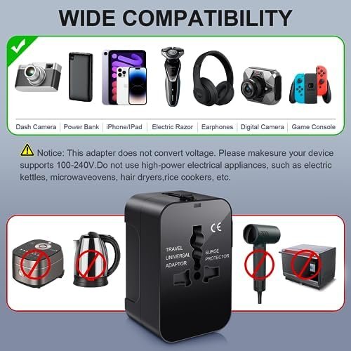 Please be advised not to use this adapter with high-power appliances (rated above the 6A max, 100-240Vac specifications), such as hair dryers, flat irons, steam irons, hot water heaters, coffee makers, etc. Our travel plug adapter does not convert voltage; please ensure your devices are compatible with the local voltage in your destination country before use.