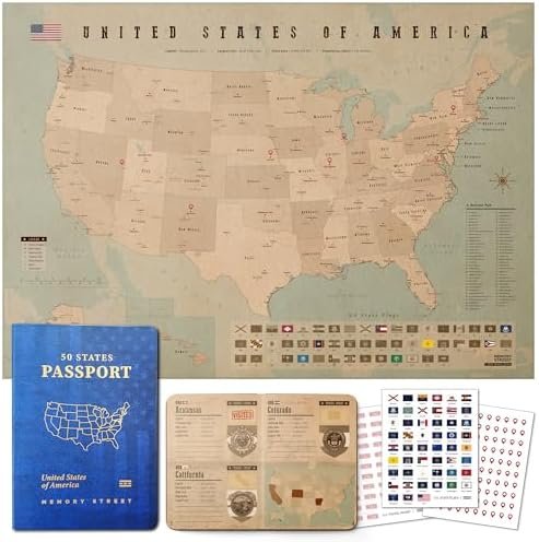 US 50 States Passport & Travel Map Kit, United States Flags Stickers Poster Gift for Travelers USA National Parks
