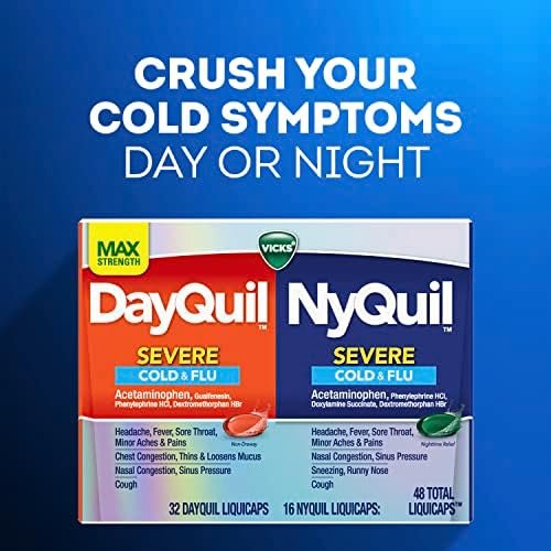When a cold comes on strong, knock it out with Vicks DayQuil and NyQuil SEVERE Cold & Flu Liquicaps. Just one dose starts working fast to relieve 9 of your worst cold and flu symptoms, to help take you from 9 to none. From the world’s #1 selling OTC cough and cold brand†, Vicks DayQuil and NyQuil SEVERE provides maximum strength relief for your worst cold and flu symptoms. DayQuil and NyQuil SEVERE provides multi-symptom relief day and night. Try Vicks DayQuil SEVERE for fast, non-drowsy daytime relief and use Vicks NyQuil SEVERE when you need maximum strength, nighttime relief for your ugliest, roughest, toughest cold symptoms so you can get the rest you need. Vicks DayQuil SEVERE provides 9-symptom relief to treat coughing, stuffy nose, minor aches, chest congestion, sinus congestion, sinus pressure, sore throat, headache, and fever. Vicks NyQuil SEVERE provides 9-symptom relief to treat coughing, stuffy nose, minor aches, sneezing, sinus congestion, sinus pressure, sore throat, headache, and fever. DayQuil and NyQuil are the #1 pharmacist recommended daytime and nighttime cough, cold & flu brands* *2022 Pharmacy Times Survey of Pharmacists OTC Recommendations † Nicholas Hall’s global CHC sales database, DB21
