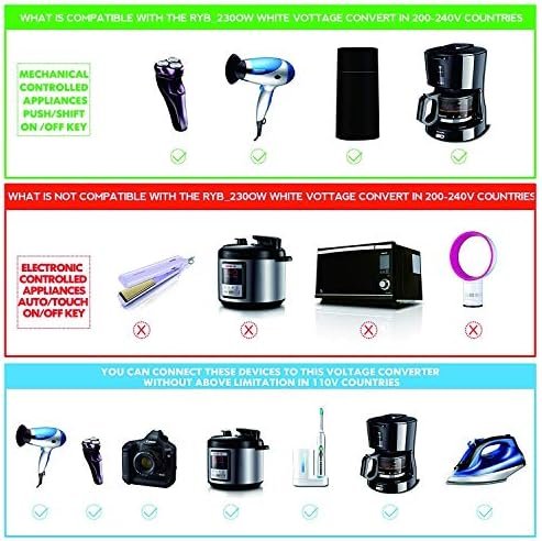 Advantage: 2300 watts, quite suitable for high power electric appliances, like as electric kettle, coffee maker, steam iron. Also for cellphone, laptop, tablet, MP3 player, digital camera, Iphone, Ipad, Ipod, MacBook, and etc. Inner heat dissipation technology without fans, so there is no noise at all when using.