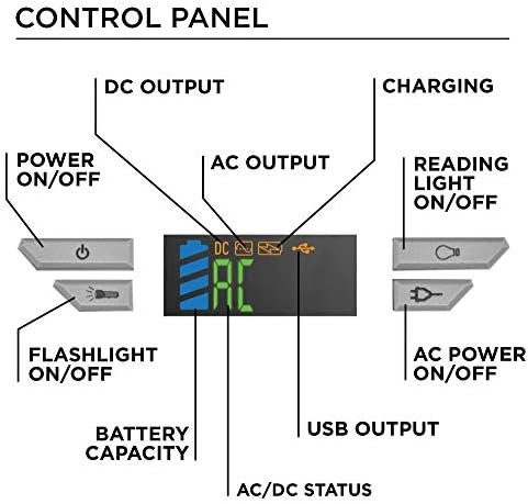 Control panel display shows battery capacity, AC/DC status, and includes DC, AC, USB, and Charging indicators