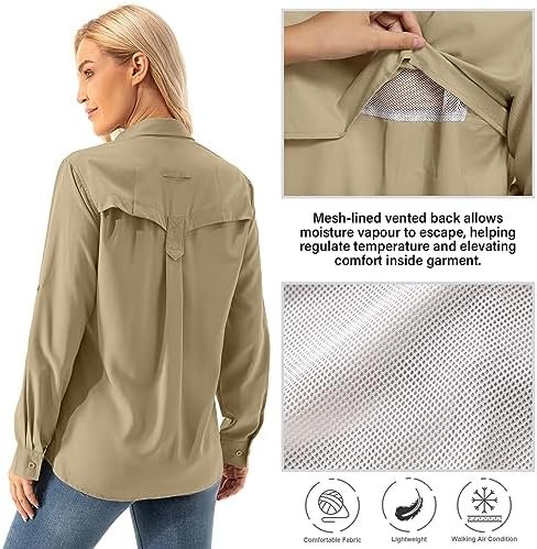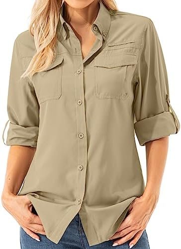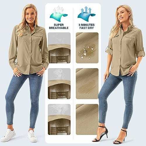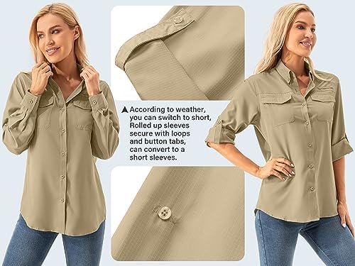 UPF 50 shirt blocks UVA and UBA ray to help prevent sunburn and skin damage during long hours in the sun.Women’s SPF safari shirt features buttons at arms to convert long sleeves to short sleeves for hotter days.Long sleeve women’s fishing shirt features quick dry fabric and Back Vents for ultimate breathability and comfort.Roll up to short sleeve shirt, casual clothes features a relaxed, lightweight fit for maximum comfort during outdoor activities.Ideal for hiking, trekking, climbing, traveling, camping, mountaineering, fishing, suitable for Spring/Summer/Autumn.With a modern classic fit, this long sleeve shirt is ultra-light and comfortable enough for maximum activity.100% Polyester, Quick dry fabric, Machine Wash.