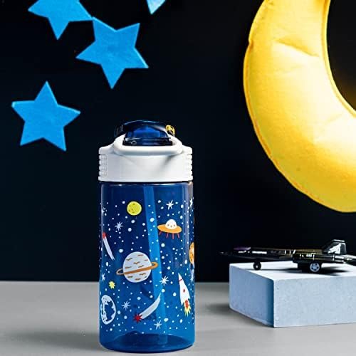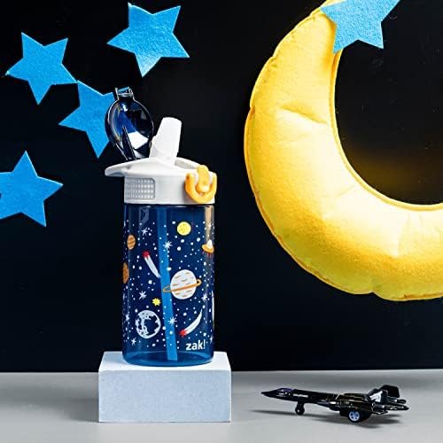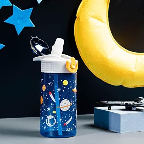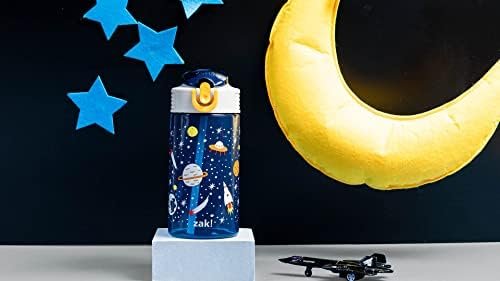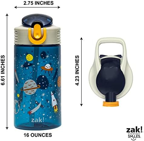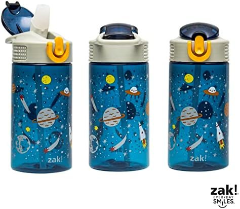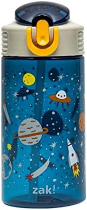 Let kids enjoy hydration with a fun water bottle by Zak Designs! Reusable and Durable Material: Reusable water bottles will last wash after wash—good news for you and the environment! The 16 oz water bottle is made of PP plastic, durable enough for kids to use every day and bring on any adventure. Leak-Proof Lid: The lid screws on securely and won’t leak when the spout is closed, though water flows for easy drinking when the spout is open. The easy-open button has a flip-up lock to keep it from activating accidentally. On the Go: The water bottle has a built-in carrying loop on the lid for easy transportation, and with the spout cover to keep the spout clean and closed, it can be tossed into a bag for worry-free travel. Specifications: 16 oz capacity. Made of durable plastic. BPA-Free – Zak is committed to safety. Dishwasher safe, do not microwave. Length: 4.23-inch, Width: 2.75-inch, Height: 6.61-inch. Design: Space.